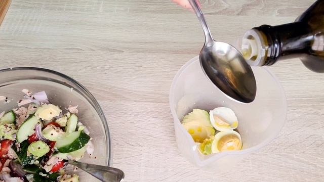 Понадобится небольшой огурец помидор красный лук половина авокадо 1 ст.л отварного киноа половина баночки консервированного тунца цедра лимона Для заправки 1 варёное яйцо пол авокадо 1.5 ст.л оливкового масла соль по вкусу сок лимона( половины) готовый салат посыпаем сверху зеленью