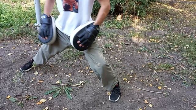 Удары руками и ногами по лапам. Ему седьмой десяток лет, а он делает двоечку,боковой и Маваши гери.