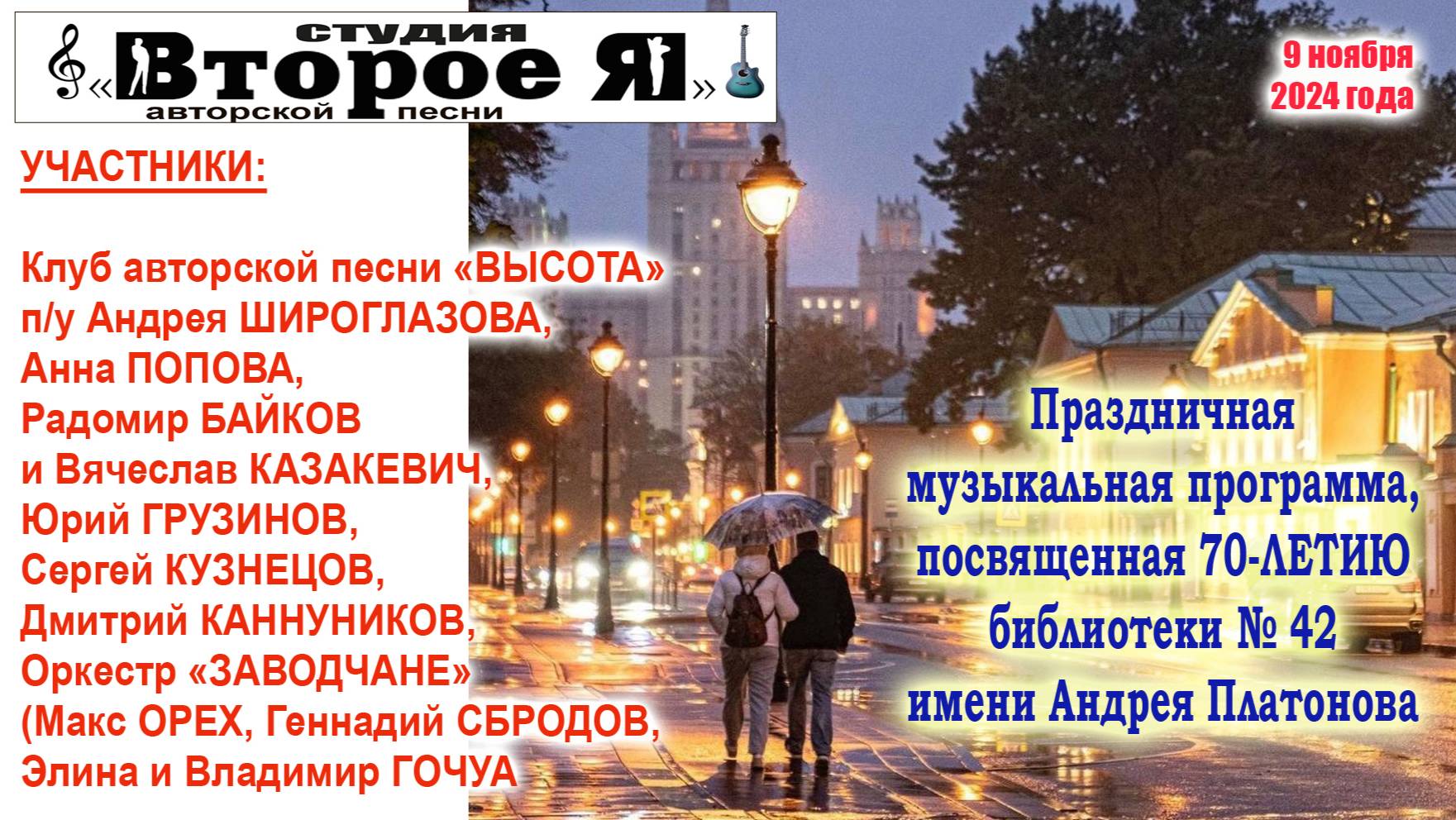 Участники: Юрий Грузинов, Сергей Кузнецов, Дмитрий Каннуников, Оркестр «Заводчане» (Макс Орех, Геннадий Сбродов, Элина и Владимир Гочуа). Оператор – Юрий Грузинов, звук – Алексей Гуськов. Продолжительность – 2 часа 39 минут. Библиотека № 42 имени А. Платонова: Москва, улица Усиевича, дом 16 (метро «Сокол). 9 ноября 2024 года.