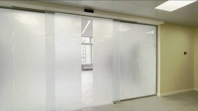 Автоматические раздвижные двери из матового стекла для входной группы с радаром безопасности