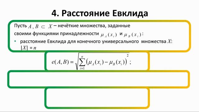 В видео представлены теоретические сведения о расчёте различных расстояний между нечёткими множествами (расстояние Хэмминга, расстояние Эвклида, относительное расстояние Хэмминга, относительное расстояние Эвклида) и рассмотрены пара практических примеров по расчёту указанных расстояний. Подготовка презентации, озвучивание и монтаж: Яков Мулдагалиев. Видео также опубликовано на Яндекс.Дзен канале "Самостоятельная работа": https://dzen.ru/profile/editor/independent_work/publications?state=pending&videoEditorPublicationId=638573f8c80ac6775010f19b