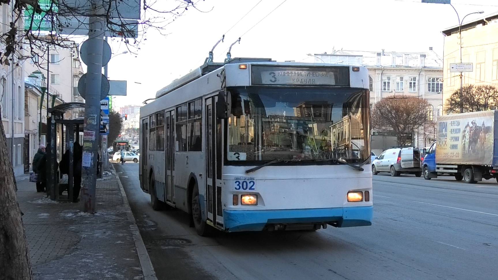 Троллейбус Тролза-5275.07 «Оптима» борт. №302 маршрут №3 "Крауля - Коммунистическая" следует через остановку Центральная гостиница (Горького). Город Екатеринбург, Россия. Приписка: Орджоникидзевское троллейбусное депо. 15.02.2023