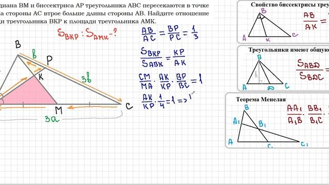 Медиана BM и биссектриса AP треугольника ABC пересекаются в точке K, длина стороны AC втрое больше длины стороны AB. Найдите отношение площади треугольника BKP к площади треугольника AMK.