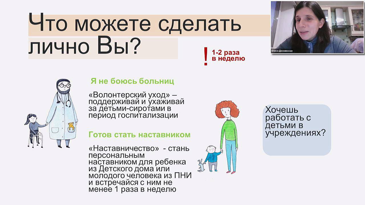 На вебинаре «Опыт работы с волонтерами БФ "Волонтеры в помощь детям-сиротам"» Олеся Деснянская, координатор программы «Профилактика социального сиротства» расскажет: О том, какие роли может выполнять волонтер при работе с семьями на грани риска изъятия/отказа от ребенка? О принципах отбора волонтеров: собеседование и/или обучение. О включении волонтеров в работу, распределении задач между добровольцами и сотрудниками. О сопровождении и поддержке волонтеров. Скачать презентацию: https://disk.yandex.ru/i/YNF8LdwHjb9YVg Организаторы вебинара: Добровольческое движение «Даниловцы» http://www.danilovcy.ru/ Школа социального волонтёрства http://volonter-school.ru/ ГБУ Центр «Моя карьера» https://mycareer.moscow/#/applicant