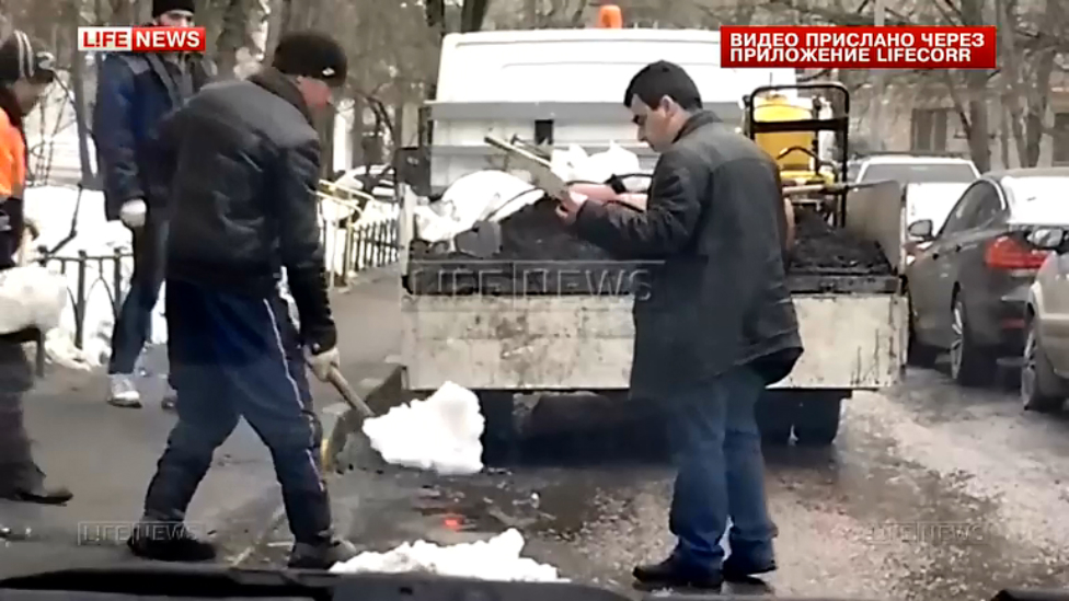 Дорожные рабочие благоустраивают дворы землей и мартовским снегом. #москва #яма #дорога #снег #рабочие #россия #рашка