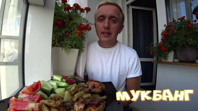 Мукбанг. Обжор. Шашлык, жареная картошка и овощи.