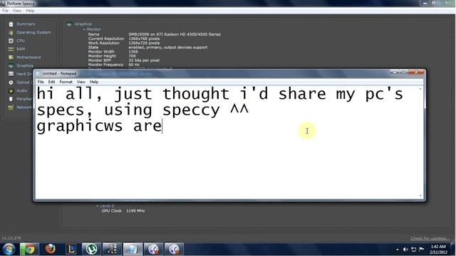 Just thought i'd share my computers specs, it's not all that great, i know, but it get's the job done, and that's enough for me, enjoy :) **SPECS** Operating System MS Windows 7 Ultimate 32-bit SP1 CPU Intel Pentium E6700 @ 3.20GHz Wolfdale 45nm Technology RAM 3.00 GB Dual-Channel DDR2 @ 333MHz (5-5-5-15) Motherboard MICRO-STAR INTERNATIONAL CO.,LTD G31TM-P21 (MS-7529) (CPU1) Dual core @ 3.2 ghz Graphics SMB1930N (1366x768@60Hz) ATI Radeon HD 4300/4500 Series (MSI) 512MB Hard Drives 39.1GB Seagate ST340014A ATA Device (PATA) 313GB Western Digital WDC WD3200AAJS-22L7A0 ATA Device (SATA) 488GB SAMSUNG SAMSUNG HD502HI ATA Device (SATA)