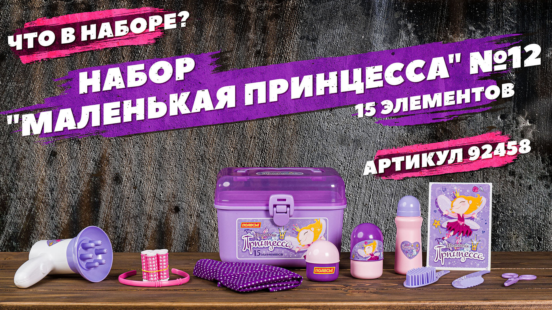 Набор "Маленькая принцесса" №12 (15 элементов) (в чемоданчике) Артикул 92458 Набор детских украшений и парикмахерских принадлежностей для маленьких красавиц от 3 лет. В набор входят: расчески - 2 шт., обруч для волос - 1 шт., бигуди с фиксаторами - 7 шт., фен - 1 шт., флакончики для косметических средств – 3 шт., ножницы – 1 шт., фартук – 1 шт. Набор упакован в чемоданчик, куда юная модница может поместить и другие свои аксессуары для волос. Игра развивает эстетический вкус у девочек, приучает следить за внешностью и прической. С набором "Маленькая принцесса" девочки могут организовать свой салон красоты или парикмахерскую, тем самым развивать воображение и фантазию. Подробнее познакомиться с представленным набором можно на нашем сайте: https://www.polesie-toys.com/catalog/seriya_igrovyih_kompleksov_malenkaya_prinessa/nabor_malenkaya_prinessa_12_15_elementov_v_chemodanchike/
