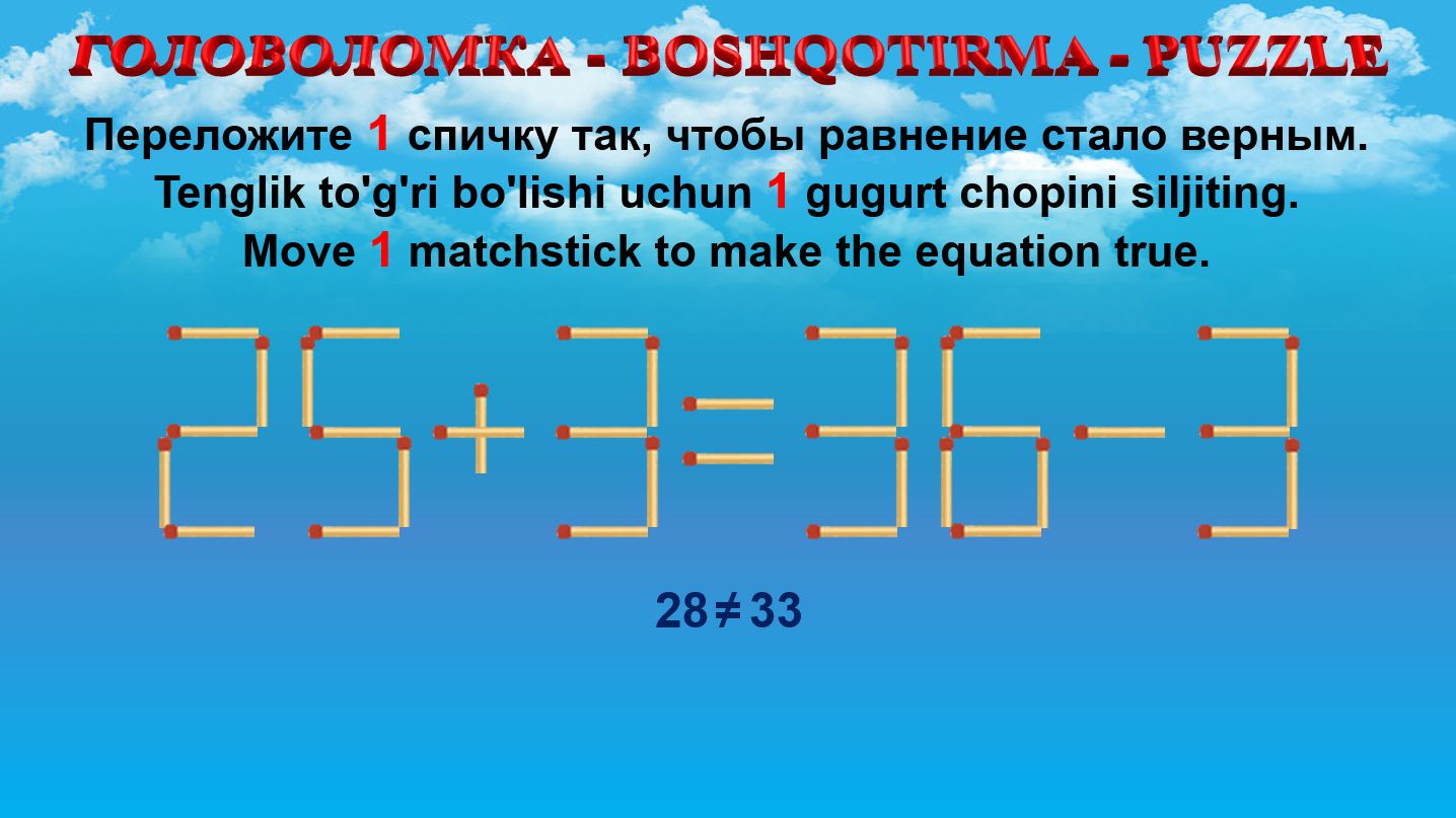 ГОЛОВОЛОМКА - BOSHQOTIRMA – PUZZLE. Спичка. 25+3≠36-3, 30+6≠36-3, 27+8≠35-3, 28+9≠39-3