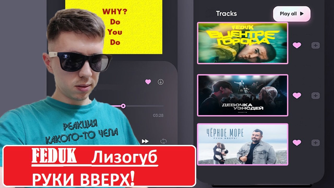 Ccылка на телеграм-канал https://t.me/whydoyoudo_official Поддержать канал, если есть желание - через Donationalerts https://www.donationalerts.com/r/whydoyoydo Заказать реакцию: на трек-50 руб; на альбом: до 15 треков-200 руб, до 25 треков - 300р, более 25 треков- 500р (АНТИХАЙПТРЕЙН-1000р) ; на баттл до 30 мин-200р, более 30 мин-300р (в сообщении с донатом указывайте названия треков, альбомов, баттлов). Оригинал источника https://www.youtube.com/watch?v=zzLdZRhgE6M https://www.youtube.com/watch?v=GSItB6R7V2g https://www.youtube.com/watch?v=-qSUDN_oju4 Подписка на канал обязательна, если хотите больше развлекательного контента в своей жизни. Таймкоды: 00:00 Вступление 00:30 FEDUK 08:15 ЛИЗОГУБ 14:50 РУКИ ВВЕРХ Данное видео создано исключительно в развлекательных целях и не имеет цели оскорбить или опорочить кого либо. Использование видеофрагментов соответствует статье №1274 Гражданского Кодекса РФ и не противоречит доктрине о добросовестном использовании США: цитирование любого материала возможно в научных, полемических, критических или информационных целях с указанием источника, автора или правообладателя.