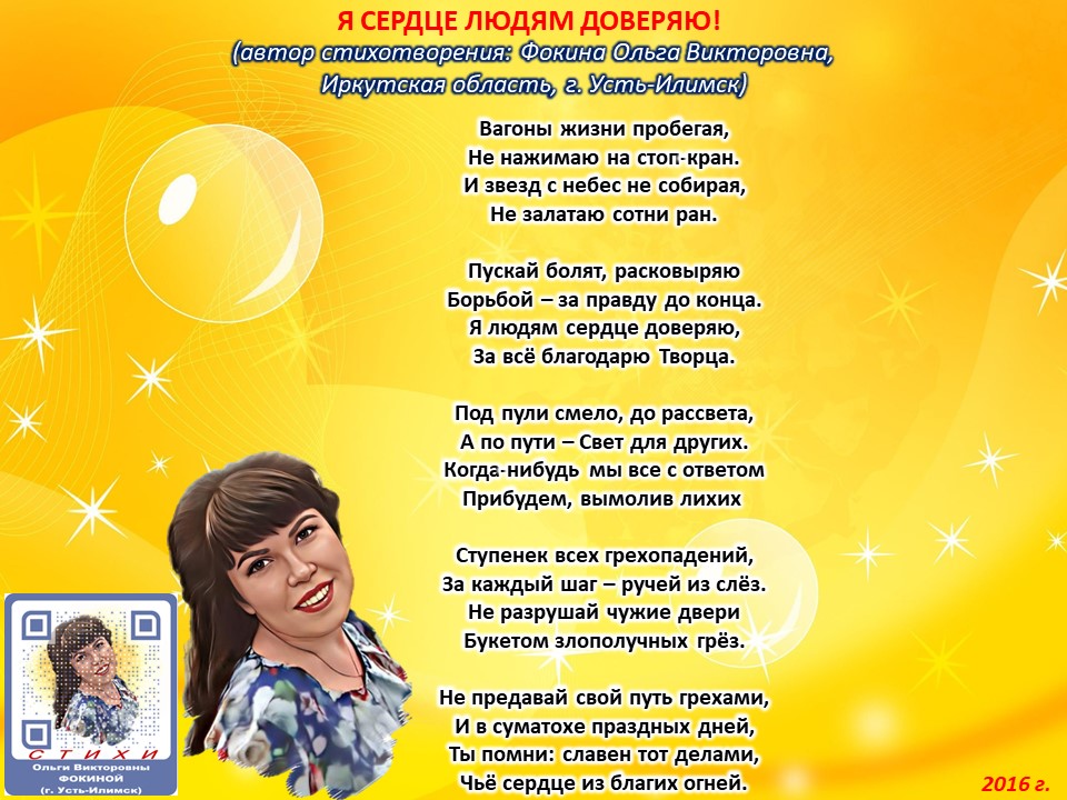 Читает автор стихотворения: ФОКИНА ОЛЬГА ВИКТОРОВНА (Иркутская область, город Усть-Илимск) СТИХИ: https://stihi.ru/2018/07/08/3790 БИОГРАФИЯ: http://www.proza.ru/2019/10/08/1473 ВЫИГРЫВАЙТЕ КНИГИ БЕСПЛАТНО: https://proza.ru/2017/09/17/447 ОТЗЫВЫ ЧИТАТЕЛЕЙ: http://www.proza.ru/2019/11/29/611 Из книги Фокиной Ольги Викторовны (Усть-Илимск) «Несу добро в ладошках!»: [все стихотворения с 2005 по октябрь 2020 гг., проза, авторские песни, интервью]. – Москва: МГО Союза писателей России, 2020 г. – 886 стр., ил. ISBN 978-5-7949-0826-8 Я СЕРДЦЕ ЛЮДЯМ ДОВЕРЯЮ! (автор стихотворения: Фокина Ольга Викторовна, Иркутская область, г. Усть-Илимск) Вагоны жизни пробегая, Не нажимаю на стоп-кран. И звезд с небес не собирая, Не залатаю сотни ран. Пускай болят, расковыряю Борьбой – за правду до конца. Я людям сердце доверяю, За всё благодарю Творца. Под пули смело, до рассвета, А по пути – Свет для других. Когда-нибудь мы все с ответом Прибудем, вымолив лихих Ступенек всех грехопадений, За каждый шаг – ручей из слёз. Не разрушай чужие двери Букетом злополучных грёз. Не предавай свой путь грехами, И в суматохе праздных дней, Ты помни: славен тот делами, Чьё сердце из благих огней. 14 декабря 2016 г.