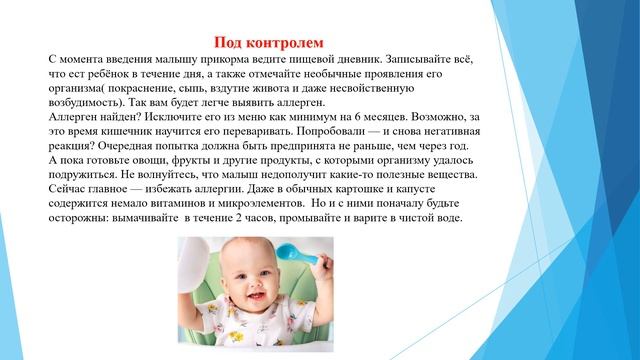 #развитиеребенка #роды #времямам Мы в Вконтакте https://vk.com/club184336554 Наш магазин одежды https://vk.com/butik_viva Наш аккаунт авитоhttps://www.avito.ru/user/1de3fe4a62a22ff57a76a4ba4ede7638/profile Развитие ребенка | ПИТАНИЕ АЛЛЕРГИКА, аллергия у детей, прикорм и диета 00:00 Аллергия у детей • Аллергия у детей может возникнуть на любой продукт, особенно если есть генетическая предрасположенность. • В разном возрасте аллергические реакции вызываются разными продуктами. • У детей до 3 лет чаще всего аллергия на белки коровьего молока. • Профилактика аллергии у малышей - грудное вскармливание. • Маме необходимо соблюдать гипоаллергенную диету. 01:49 Прикорм и диета • Ввод прикорма должен быть осторожным и постепенным. • Начинать с продуктов, которые наиболее безопасны в плане аллергии. • Вести пищевой дневник, чтобы выявить аллерген. • Исключить его из меню на 6 месяцев. • При перекрёстной аллергии, исключить продукты, содержащие родственные аллергены. 03:26 Календарь цветения и аллергия • При аллергии на цветение растений, избегать контакта с пыльцой. • При аллергии на злаки, избегать пшеницы, овса, ячменя. • При аллергии на полынь, избегать георгина, подсолнуха, ромашки, одуванчика. • В еде, опасаться цитрусовых, семечек подсолнечника, мёда. 05:14 Антигистаминные препараты • Подобрать антигистаминные препараты может только врач. • Детская суточная норма жидкости - 30 мл на 1 кг веса. • Безопасные напитки: вода, компот из сухофруктов, зелёное яблоко, груша.
