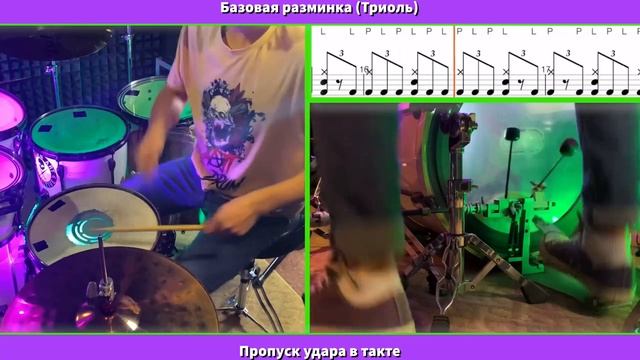 Базовая разминка в триоли двойной педалью. Пропуск удара в такте . Учимся играть на барабанах.