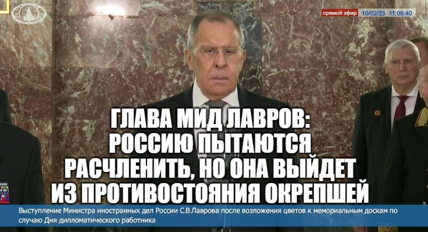 Призывы к "расчленению" России звучат все громче, но РФ выстоит и выйдет из этой ситуации сильнее, заявил Сергей Лавров Выступление Министра иностранных дел С.В.Лаврова после возложения цветов к мемориальным доскам по случаю Дня дипломатического работника, 10/02/23 "Те, кто пытаются контролировать всю международную повестку дня, те, кто пытаются контролировать и мирохозяйственные связи, и всю международную политику, они решили нанести России стратегическое поражение, решили перенять печальный опыт Наполеона и Гитлера, открыто декларируя цель уничтожить Россию или максимально ее ослабить, но все громче и громче звучат их призывы к расчленению нашей Родины", - сказал Лавров после возложения цветов к мемориальным доскам по случаю Дня дипломатического работника. "Ясно, что мы не только выстоим, мы выйдем из этого противостояния еще более окрепшие, еще более убежденными в том, что необходимо выстраивать международные отношения на справедливой, равноправной основе как этого требует устав ООН и который сейчас пытаются подорвать наши западные коллеги, навязывая миру не универсально применимое международное право, а свои собственные правила", - добавил глава российской дипломатии. Источник: https://vk.com/video-70034991_456249308 #новости #россия #мидроссии #мид_рф #мид #мид #лавров #запад #сша #евросоюз #европа #политика