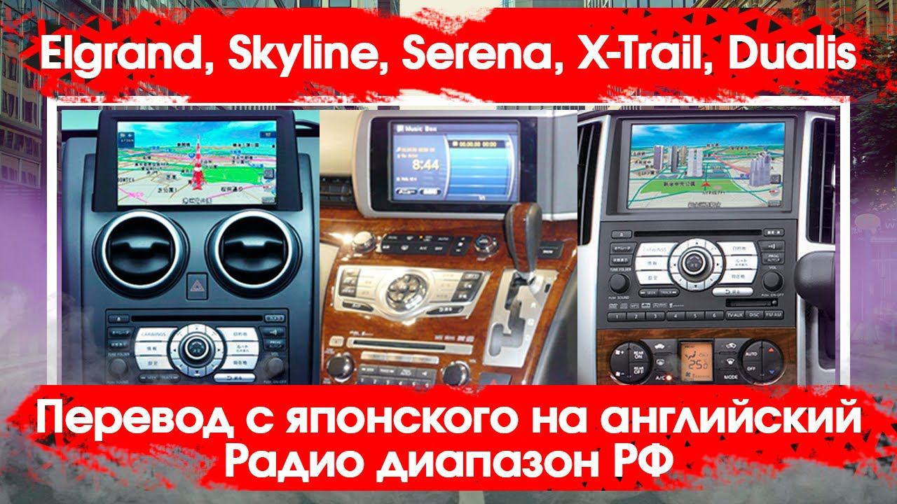Nissan Elgrand,Skyline,Serena,Dualis,Tiida (2006-2006 HDD) - английский язык, евро радио для России. Переделываются исключительно автомобили праворульные с внутреннего рынка Японии! Нашей компании успешно удалось заменить японские иероглифы на английский язык и сделать сетку вещания для использования в России. На данном этапе услуга оказывается методом подмены оборудования. В наших ближайших планах выдать это решение для удаленной установки, возможно получится решить задачу с навигацией. Если Вам хочется большей функциональности, рекомендуем Вам рассмотреть возможность замены 06 системы (2006-2008) на 08 (2010-2018), они совместимы при условии доработки программного обеспечения и переходников. Приводим список, модельный ряд где применимо данное решение. - Bluebird Sylphy G11 - Dualis J10 - Elgrand e51 - Fairlady Z34 - Fuga Y51 - GTR R35 - Lafesta B30 - Latio c11 - Murano z51 - Presage u31 - Serena c25 - Skyline v36 - Teana J32 - Tiida c11 - Wingroad Y12 - X-Trail T32