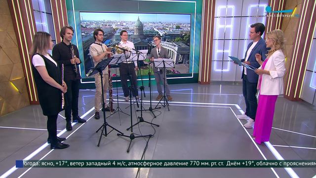 В студии программы «Утро в Петербурге» Анна Комарова, Александр Быков, Георгий Радзевич, Георгий Прибылов и Лев Журавский, лауреаты международного конкурса.
