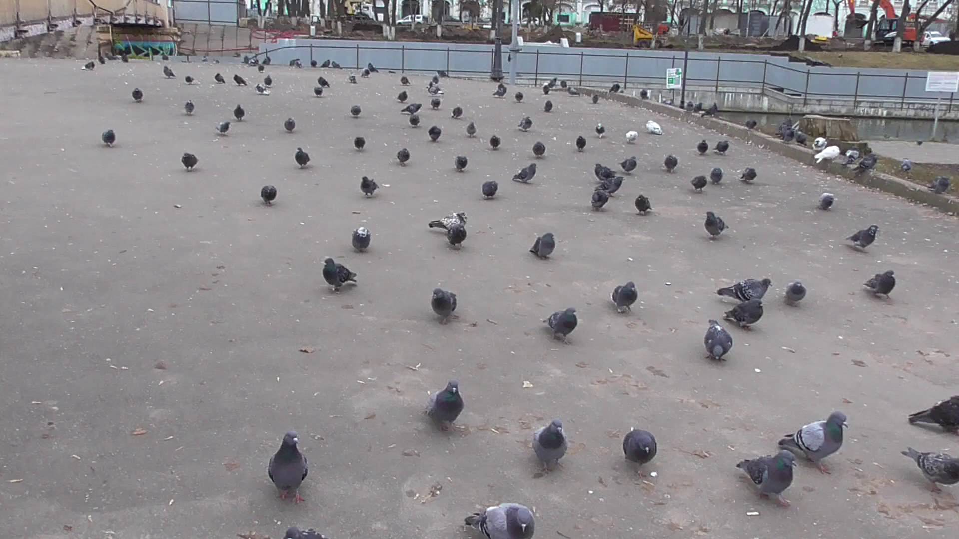 Много голубей в городе. Утки плавают на реке. В конце видео Геннадий Горин и водопад