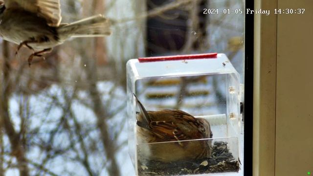 Воробьи в кормушке на окне