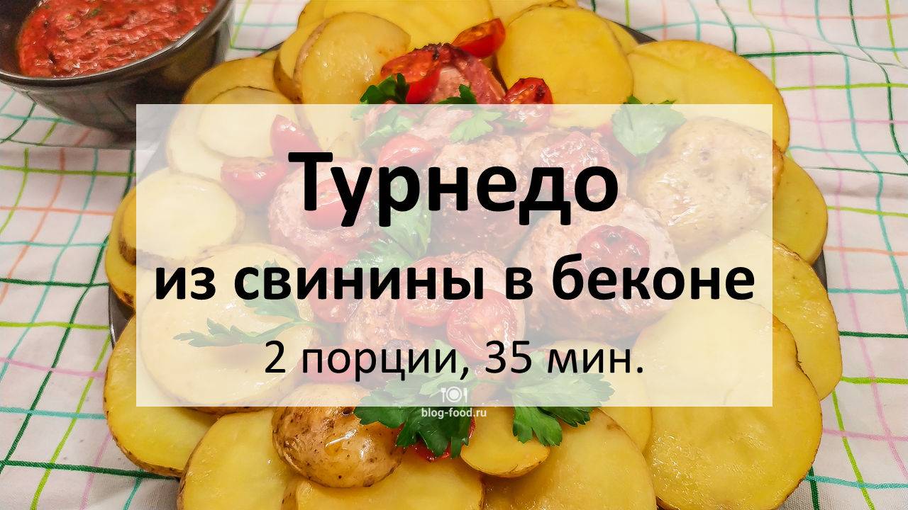 Всем привет. Сегодня у нас в гостях французский гость — турнедо. До самой известной разновидности этого блюда «Турнедо Россини» нам дороговато, однако ничто не мешает сварганить вкусную штуку из более простых продуктов. Кстати, 7 лет назад мы делали нечто подобное, и тогда рецепт от Шефмаркета был ближе к оригиналу (говяжья вырезка, свежий шалфей и т. д.), но времена меняются, цены кусаются всё больнее и сегодня готовим из более доступных ингредиентов. • Картошка, 500 гр. • Свиная вырезка, 360 гр. • Бекон с/к 6 шт. • Помидоры черри, 6-8 шт. • Сушёный шалфей, 1 ч. л. • Молотый чеснок, 1 ч. л. • Петрушка • Растительное масло, соль Разогреваем духовку до 180°С. Картошку моем, нарезаем кружками 2-3 мм толщиной, мясо режем на 6 частей, помидоры разрезаем пополам. Картошку отвариваем в подсоленной воде 15 минут. На полоски бекона крошим шалфей, заворачиваем мясо. Обжариваем рулеты на сильном огне по минуте с каждой стороны, сковороду сохраняем. Выкладываем картошку и рулеты на противень, солим, по вкусу, посыпаем молотым чесноком и отправляем в духовку на 15 минут. На сковороде из-под мяса обжариваем помидоры со стороны срезов пару минут. Подаём, украсив петрушкой и помидорами. Приятного аппетита! Текстовая версия на сайте: https://blog-food.ru/1254