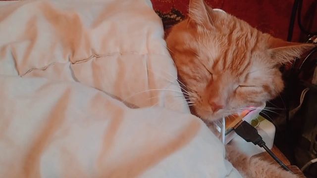 Кот спит под одеялом