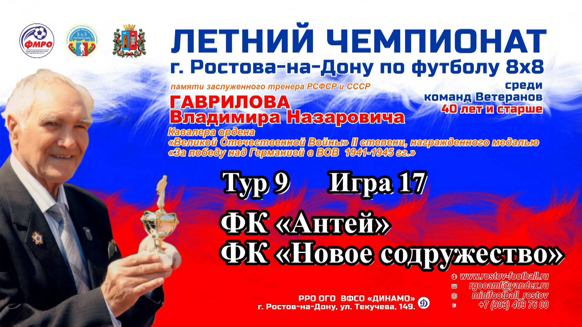 Летний Чемпионат г. Ростова-на-Дону по футболу 8х8 памяти заслуженного тренера РСФСР и СССР Гаврилова Владимира Назаровича, Кавалера ордена «Великой течественной войны» II степени, награжденного медалью «За победу над Германией в ВОВ 1941-1945 гг.» среди команд ветеранов 40 лет и старше. Проводящие организации: Ростовская городская общественная организация «Ассоциация мини-футбола» (РГОО «АМФ»), Региональная общественная организация «Федерация микрофутзала Ростовской области» (РОО «ФМРО»). Участвующие команды: 1. ФК «Заря» г. Ростов-на-Дону (президент Аксенов Максим, начальник команды Устенко Алексей, тренер Шипилов Антон) 2. ФК «Антей» г. Ростов-на-Дону (руководитель Макарьев Антон) 3. ФК «СКА-84» г. Ростов-на-Дону (руководитель Карташян Ованес) 4. ФК «Форум» г. Ростов-на-Дону (руководитель Кирсанов Алексей) 5. ФК «Новое содружество» г. Ростов-на-Дону (президент Губский Андрей). Главный судья соревнований Виталий Сургучёв www.rostov-football.ru