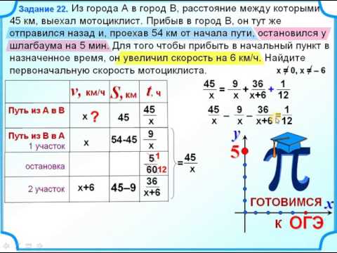 8 класс. Дробно-рациональное уравнение Из города А в город В, расстояние между которыми 45 км, выехал мотоциклист. Прибыв в город В, он тут же отправился назад и, проехав 54 км от начала пути, остановился у шлагбаума на 5 мин. Для того чтобы прибыть в начальный пункт в назначенное время, он увеличил скорость на 6 км/ч. Найдите первоначальную скорость мотоциклиста.