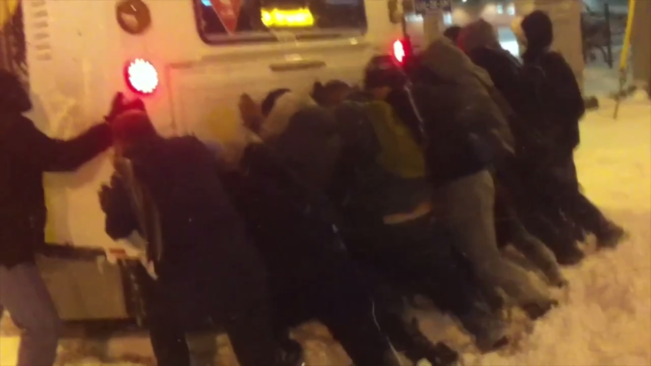 В канадском Монреале группа спортсменов-добровольцев решила заняться общественно полезными делами вместо тренировки в тренажерном зале - они выталкивали общественный транспорт из сугробов. #помощь#снег#спорт