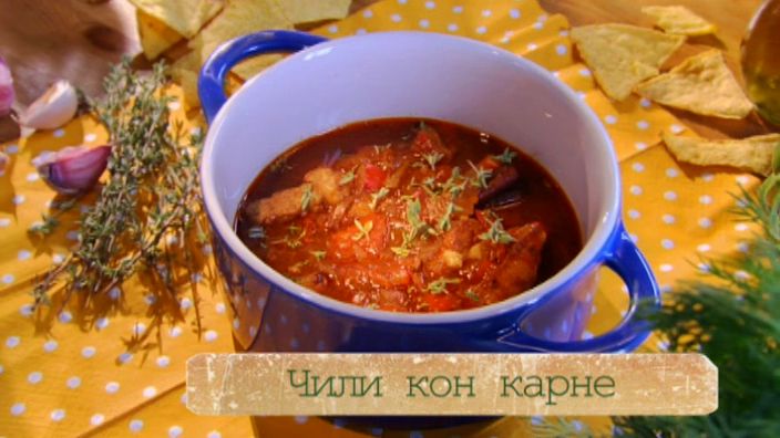 Ингредиенты: Сырая говяжья грудинка — 300 г Морская соль, молотый перец, кумин, паприка, орегано Томаты в собственном соку - 1/2 банки Говяжий бульон - стакан Болгарский перец - 1 шт. Палочка корицы Лавровый лист Красный лук - 1 шт. Чеснок - 1-2 зубчика Перец чили - 1 шт Петрушка - 2-3 веточки Начос Кукуруза для подачи Приготовление: Сочное и ароматное чили кон карне будем подавать со свежей кукурузой и чипсами начос. Говяжью грудинку обсушим и разрежем на небольшие кусочки. Натрем мясо оливковым маслом и специями: зирой, орегано, паприкой и морской солью. Обжарим мясо на хорошо прогретой сковороде, как только появится румяная корочка, переложим мясо в форму для запекания, а на оставшемся жире жарим красный лук, чеснок и перец чили. Заливаем томаты в собственном соку и сразу добавляем сахар, корицу и говяжий бульон. Солим и перчим. Доводим до кипения, сладкий перец режем соломкой и добавляем в форму к мясу. Заливаем соусом, накрываем фольгой и ставим в духовку на 2 часа на 160 градусов.