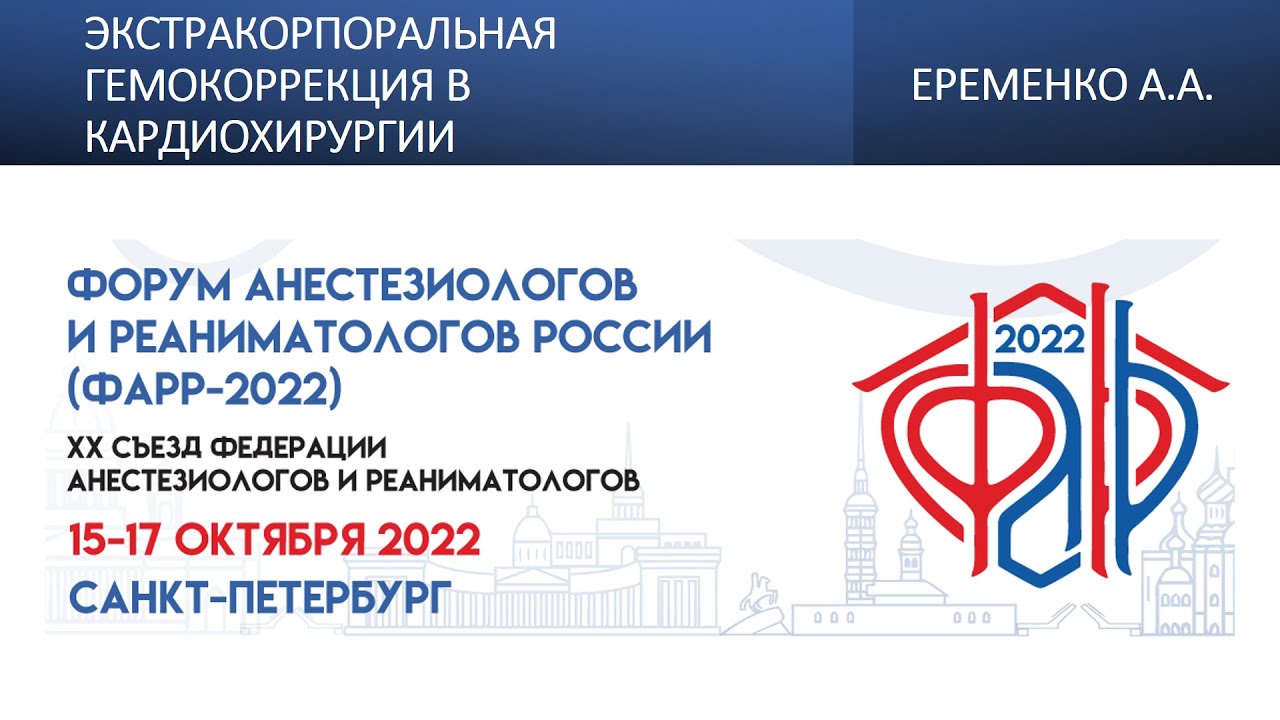Видеозапись ФАРР-2022, XX съезд Федерации анестезиологов и реаниматологов 15-17 октября 2022, Санкт-Петербург. Александр Анатольевич Ерёменко "Экстракорпоральная гемокоррекция в кардиохирургии"