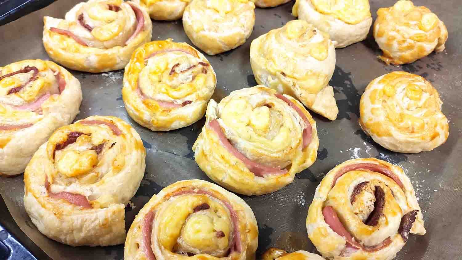 Слойки (рулетики) с ветчиной и сыром на слоеном тесте. Быстрая выпечка к чаю