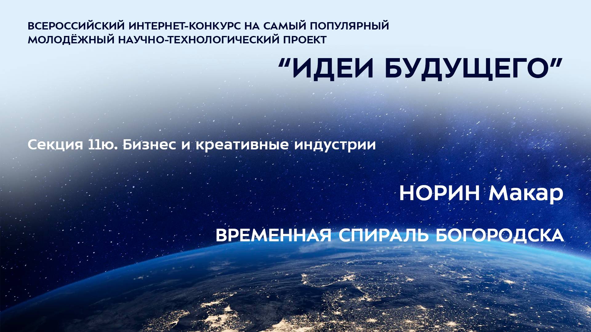 (11Ю-16) НОРИН Макар Константинович Московская область, г. Ногинск АНОО «Ломоносовский лицей», 4 класс ВРЕМЕННАЯ СПИРАЛЬ БОГОРОДСКА Научный руководитель: Гвиниашвили Цира Мерабовна, Московская область, г. Ногинск, АНОО «Ломоносовский лицей», учитель начальных классов Более подробно о мероприятиях Программы "Шаг в будущее" можно узнать на сайтах http://www.step-into-the-future.ru/ и http://шагвбудущее.рф
