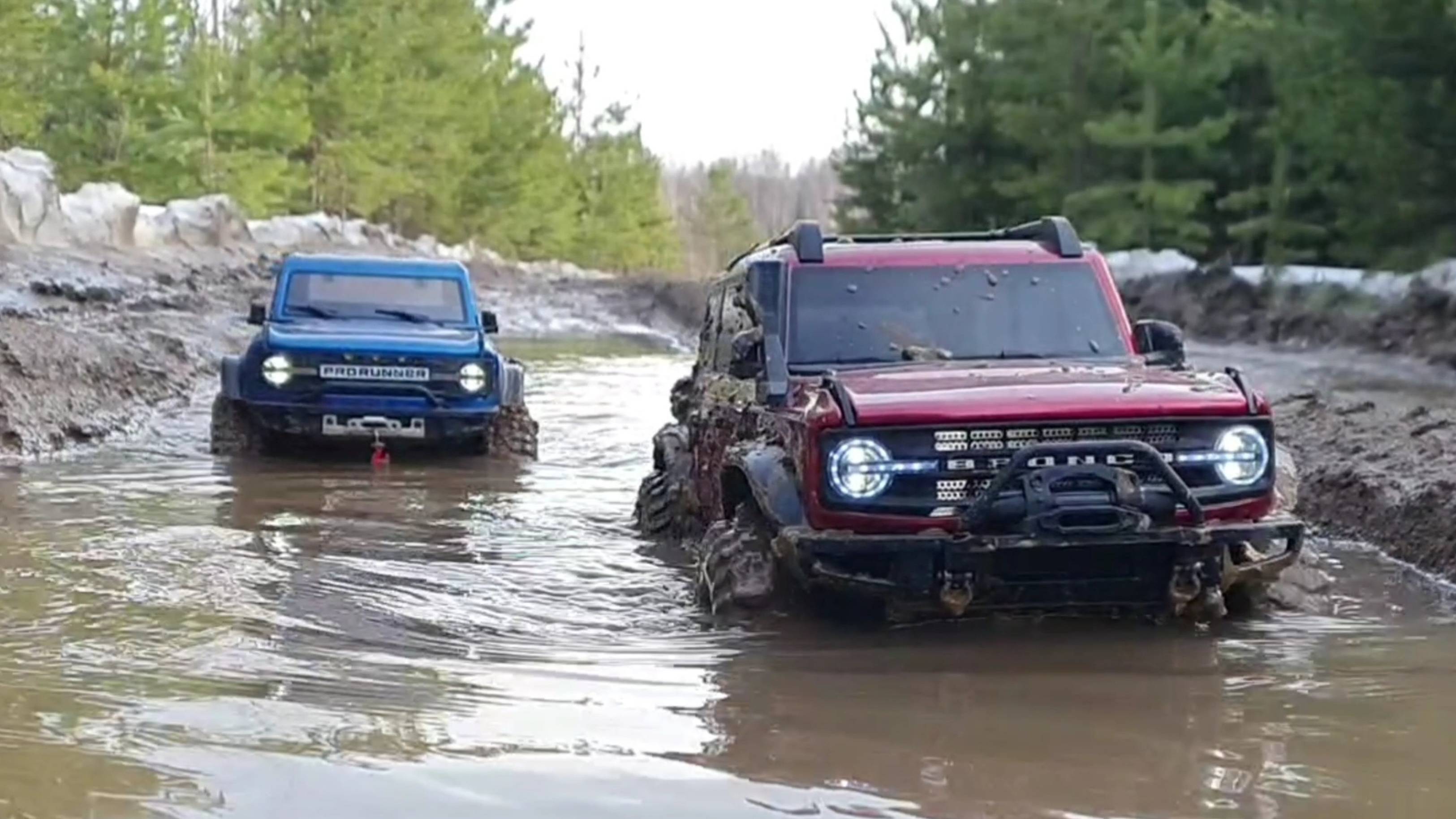Видео о том как радиоуправляемые внедорожники в стиле Bronco играючи преодолевают грязевое бездорожье.