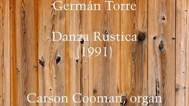 Germán Torre (b. 1957) — Danza Rústica (1991) for organ Carson Cooman, organ Germán Torre (b. 1957) is an Argentinian composer, keyboardist, and conductor. Educated in Buenos Aires and La Plata, Torre studied organ with Héctor Zeoli (who encouraged his first compositions) and composition with Juan Francisco Giacobbe (a student of Ravel and significant figure in the development of an Argentinian national style). Torre was organist of the cathedral in La Plata from 1976–86. He has appeared as organist, harpsichordist, pianist in concerts throughout the world and has composed works in many genres including several acclaimed ballet scores. Torre was a founder of the Ensemble da Camera Arcangelo Corelli, a group specializing in baroque music. He also directed the Schola Cantorum of La Plata Catholic University Law School. While maintaining many musical activities in Argentina, he has resided for years in Gera Lario on Lake Como, Italy.