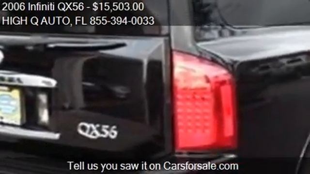 This 2006 Infiniti QX56 is for sale in Plantation, FL 33317 at HIGH Q AUTO. Contact HIGH Q AUTO at http://www.carsforsale.com/vehicle/details/7262707 Engine: V8 5.6L V8 Transmission: Automatic 5-Speed Color: Liquid Onyx Mileage: 108713 Contact HIGH Q AUTO 747 N. State Road 7 Plantation, FL 33317 to test drive this 2006 Infiniti QX56 today.