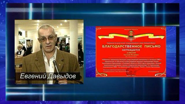 Давыдов Евгений Петрович (род. 19 июня 1958 года, Долгоруково Липецкая область) - Советский и российский журналист. Член Союза журналистов России. Основатель ТТО «Монолит», которое было основано в декабре 1994 года как организация по производству лицензионных теле- и радиопередач по заказу теле- и радиокомпаний России. За время работы был снят больший цикл передач с композиторами, актерами, певцами, музыкантами, политиками. Отдельное место в жизни занимало личное знакомство с Т. Н. Хренниковым. Автор книги «Жизнь отданная музыке» (2007) и циклов теле и радио передачи о жизни и творчестве Т. Н. Хренникова. В 2008 году к 95-летию со дня рождения Т. Н.Хренникова был выпущен CD-диск. Звуковая версия телепередач с его участием. Лауреат премии А.А Вермишева в 1999 году за создание программы «О чем думает Дума». Лауреат премии А.А Вермишева в 2013 году за издание книги «Жизнь отданная музыке». Лауреат премии имени Т. Н. Хренникова (2013). "ЛЕГЕНДА журналистики Липецкой области" (2022)