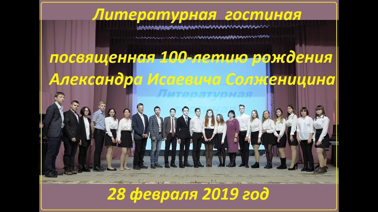 Литературная гостиная,посвященная 100-летнему юбилею рождения А.И.Солженицына. Подготовлена и проведена педагогом Санниковской СОШ Ириной Михайловной Домановой и учащимися старших классов школы при активной поддержке и помощи работников Санниковского модельного ДК и музыкальной школы. Звукорежиссер Никита Рихерт и Игорь Ишутин, фото видеосъёмка Геннадия Городилова. 28 февраля 2019 год. Санниковский модельный ДК.