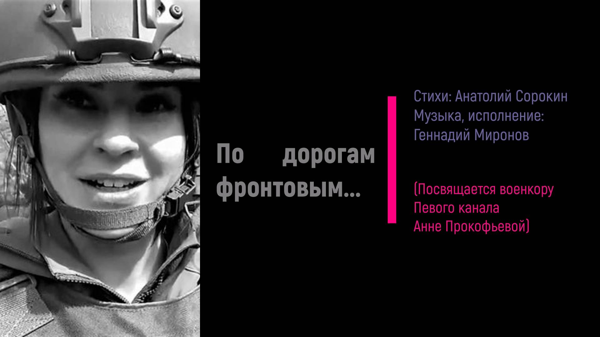 Песня посвящается военкору Первого канала Анне Прокофьевой… По дорогам фронтовым, мимо лесополок, Шла всегда она к своим, к тем, кто был ей дорог. Шла по выжженной земле, истоптав все берцы, И сжималось всё сильней любящее сердце. Шла туда, где ни один не был штурмовик. Из последних своих сил шла на детский крик. По ночам считала звёзды, вглядываясь в небо. По щекам катились слёзы будущей Победы. По дорогам фронтовым, мимо колоколен, По весне ушла к своим в ангельской колонне. Но в сердцах простых людей стих её не стих - Положила жизнь свою за друзей своих. В уголке горит лампадка и стоит иконка. Кротко молятся солдаты за свою сестрёнку. По дорогам фронтовым, по степным дорогам, Шла сестрёнка их к своим, улыбаясь Богу. (Анатолий Сорокин)