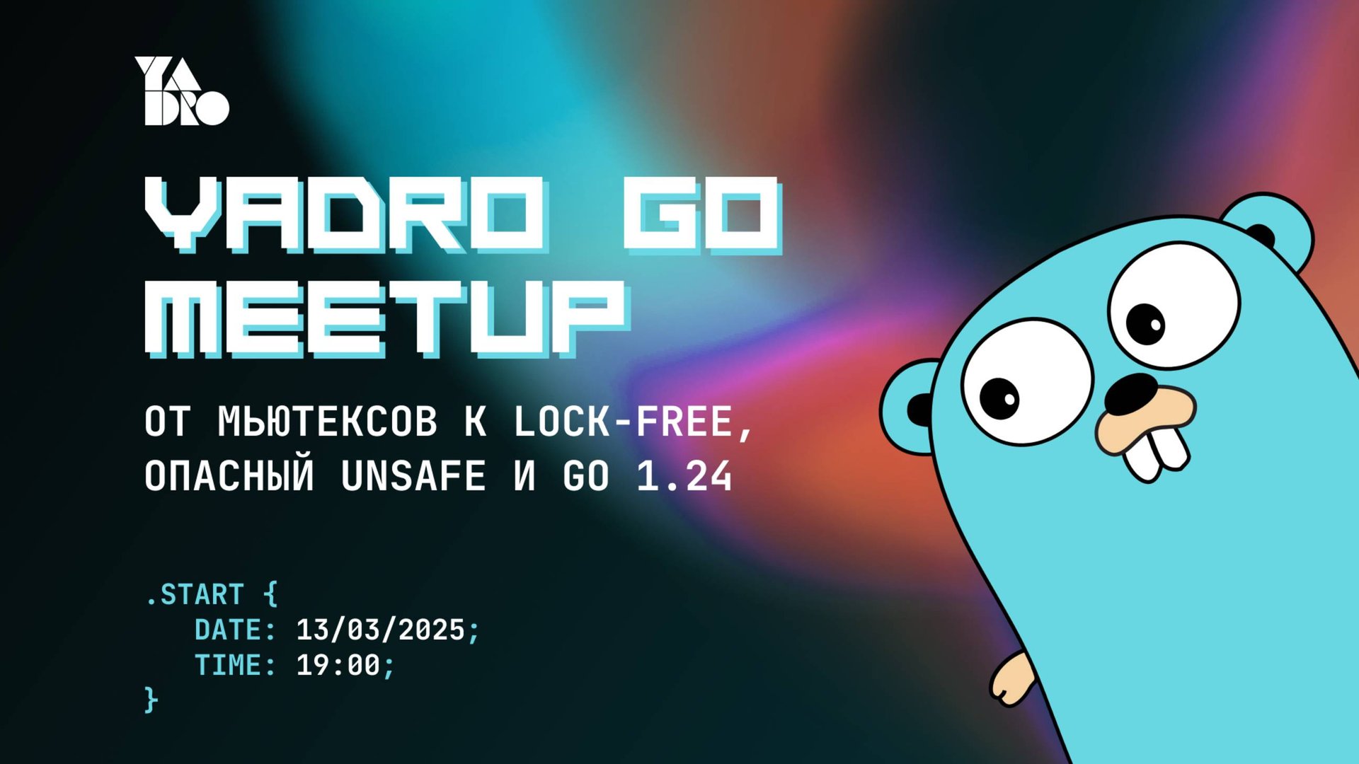13 марта в Москве и онлайн пройдет встреча Go-разработчиков. Узнаем об опасных местах и областях применения пакета unsafe. Обеспечим высокопроизводительную конкурентность в Go. А в рамках дискуссии узнаем, что нового появилось в Go 1.24 и как это повлияет разработку. 19:00 — вступительное слово от организаторов. 19:10 - От мьютексов к lock-free: как обеспечить высокопроизводительную конкурентность в Go. - Илья Уваркин, YADRO 20:00 - перерыв 20:30 - Погружение в мир без правил с пакетом unsafe. - Нина Пакшина 21:20 - Перерыв 21:30 - Go 1.24: Куда движется язык? - Даниил Подольский (YADRO), Павел Агалецкий (AvitoTech), Александр Иванов (YADRO), Игорь Панасюк (Yandex) Подробности о докладах и анонсы следующих митапов вы найдете на нашем Хабре https://habr.com/ru/companies/yadro/articles/