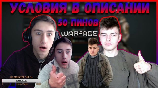 ? ДОНАТ ? https://www.donationalerts.com/r/sashuwa ? РОЗЫГРЫШ 50 ПИН-КОДОВ WARFACE ? Среди 50 победителей будет один кому достанется Beretta ARX160 НАВСЕГДА! Очень много, ПИН-КОДОВ на оружие! Совместно с каналом "Коля Селиванов" разыгрываем 50 ПИН-КОДОВ. УСЛОВИЯ ДОСТАТОЧНО ПРОСТЫ. 1.ПОДПИСАТЬСЯ НА МОЙ КАНАЛ (https://www.youtube.com/channel/UC1CKCS0fL1yC0jDLxQJEFiw/featured?view_as=subscriber) ПОДПИСАТЬСЯ НА КАНАЛ КОЛИ (https://www.youtube.com/channel/UCQsxCve2mwhhQPosEqR9tWg) 2.ПОДПИСАТЬСЯ НА МОЮ ГРУППУ (https://vk.com/sashuwa) ПОДПИСАТЬСЯ НА ГРУППУ КОЛИ (https://vk.com/kolyaselivanovstream) 3.РЕПОСТНУТЬ ЗАКРЕПЛЕННЫЕ ЗАПИСИ В ОБЕИХ ГРУППАХ. РЕЗУЛЬТАТЫ 04.02.2019 ССЫЛКА НА КАНАЛ МОЕГО ДРУГАНА https://www.youtube.com/channel/UCQsxCve2mwhhQPosEqR9tWg Группа ВК https://vk.com/public177557593 Мой ВК https://vk.com/kane_hardlain Мой INSTAGRAM https://www.instagram.com/sashuwafiftysix/?hl=ru Наш с Колей INSTAGRAM https://www.instagram.com/sashuwaandselivanov/?hl=ru ✔ МОЙ КОМПЬЮТЕР ✔ ✔ ПРОЦЕССОР Intel Core i3-8100 ✔ МАТЕРИНСКАЯ ПЛАТА H310 GigaByte H310M S2P mATX ✔ ОЗУ 2*8 gb DDR4 2133 MHz ✔ ВИДЕОКАРТА Palit GeForce GTX 1060 6gb. ✔ МОНИТОР Samsung SyncMaster T240 60 ГЦ ✔ КЛАВИАТУРА SteelSeries APEX ✔ НАУШНИКИ SteelSeries Siberia V2 Na'Vi Edition ✔ МЫШКА SteelSeries Sensei RAW ✔ ВЕБ КАМЕРА Logitech c270 ✔ КОВРИК SteelSeries QcK mini ✔ МИКРОФОН Trust Starzz All-round