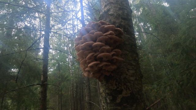 Дерево в опятах и дождь в лесу