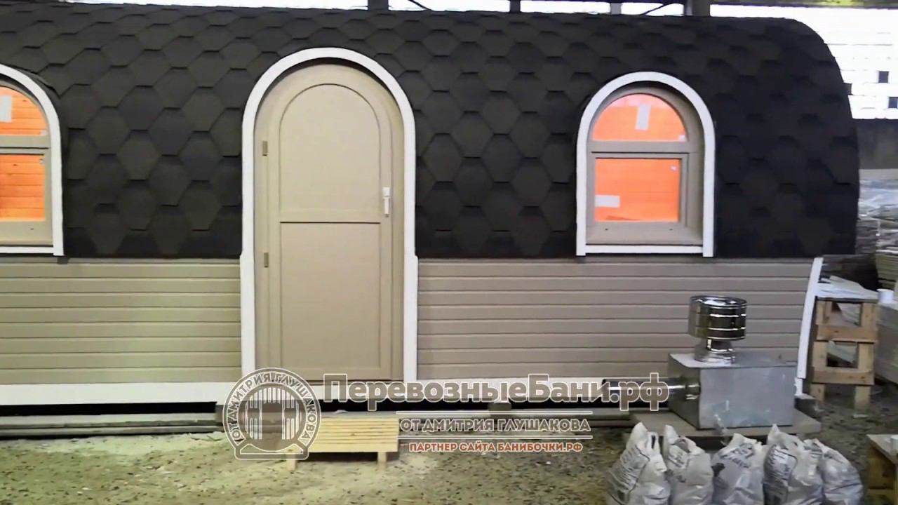 Необычная форма перевозной бани с арочными окнами и дверями