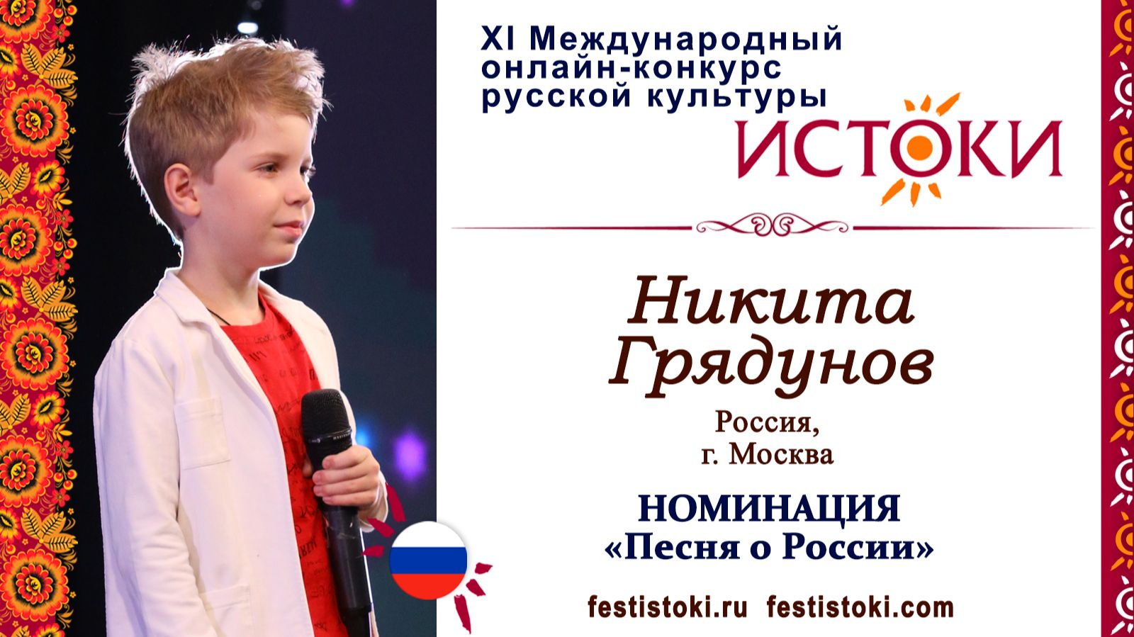Участник ХI Международного онлайн-конкурса русской культуры "Истоки". Номинация "Песня о России". Песня "Родина". Авторы О. Дворянцева, В. Неткачев. Сайт: festistoki.ru / festistoki.com E-mail: festistoki@mail.ru