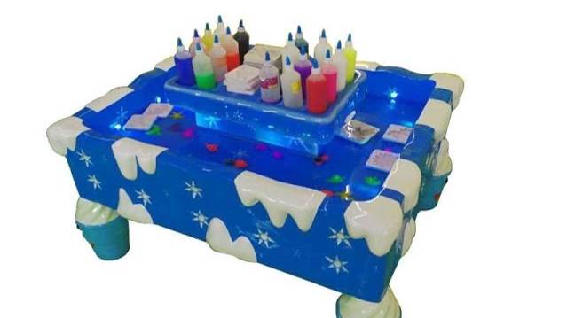 Подробнее: https://robotail.ru/p405186887-fabrika-slajmov.html В 'канаву' стола заливаем воду. Карандаши - это пластиковые тюбики в которых жидкое вещество, которое заливается в красивую форму, затем форма опускается в воду. При при нахождении в воде вещество густеет и становится похожим на игрушку лизун. В комплекте: 35 бутылок с лизунами 30 штук форм Размер Д120, ш100, в 80 Материал стекловолокно Теги: игровой стол,стов в детскую зону,для игровой комнаты,интересная игровая зона,интересная игровая комната