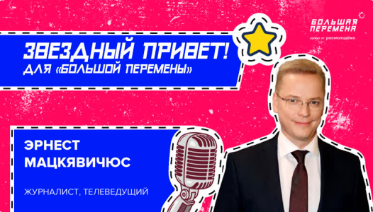 ?Ведущий программы «Вести» на канале «Россия-1» Эрнест Мацкявичюс снова на связи с «Большой переменой». Сегодня Эрнест рассказывает о своей профессиональной мечте — сделать программу-интервью и о том, как режиссер уверяла, что из знаменитого журналиста никогда не получится интервьюера. Знаешь, как эта история зарядила нашего героя мотивацией? Смотри новый выпуск «Звездного привета» и учитывай этот важнейший опыт. #БольшаяПеремена #ЗвездныйПривет=