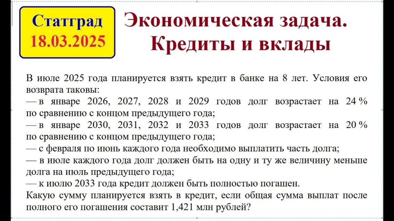 1 Задачи на вклады и кредиты. Статград, 18.03.2025.