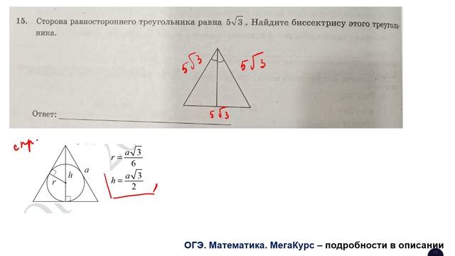 ОГЭ. Математика. Задание 15. Сторона равностороннего треугольника равна ... Найдите биссектрису