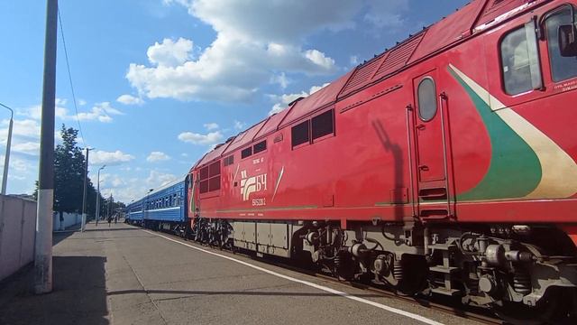Тепловоз ТЭП70БС-147 с поездом №605Б Полоцк-Брест с вагонами Полоцк-Гомель уезжает из Полоцка