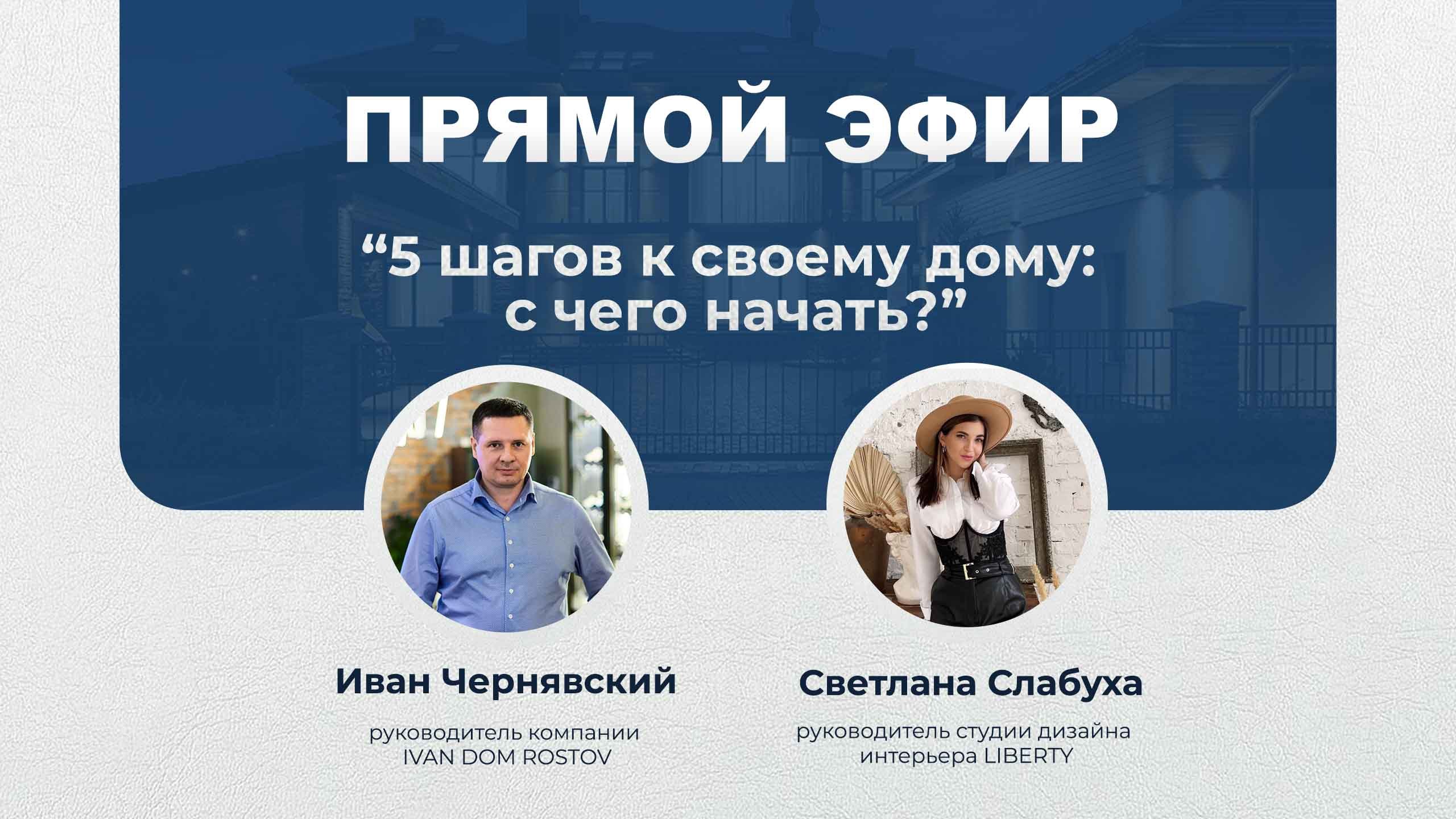Прямой эфир Ивана Чернявского (руководителя "IVAN DOM ROSTOV") со Светланой Слабуха (руководителем студии "Liberty") ? Публикуем ценную информацию, для тех, кто пропустил. На эфире мы обсуждали основные темы: 1. Что самое важное при принятии решений о строительстве? 2. Построить свой или купить готовый - что лучше? 3. Стоимость Как сделать так, чтобы строительство стоило столько, сколько вы запланировали? 4. Возможности современного дома. 5. А с чего же всё-таки начать? Будем рады, если вы поделитесь своим мнением, посмотрев видео.