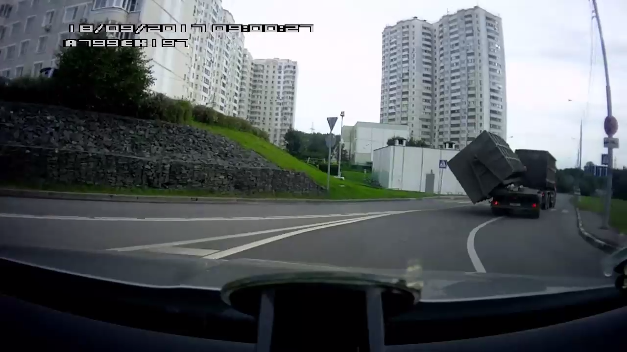 Водитель решил не идти на обгон грузовика и правильно сделал, на повороте с большегруза упал контейнер прямо на его полосу дороги. #дтп #везунчик #обгон