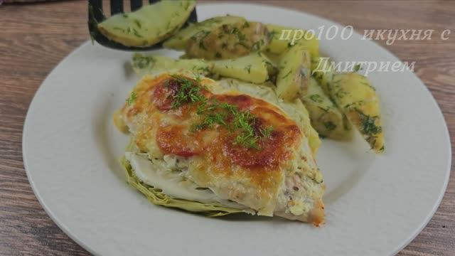 Приготовление и ингредиенты: Нарежьте 1 кочан, как показано на видео. Выложить на противень, застеленный бумагой для выпечки. Добавьте соль. 2 куриные грудки. Разрезать на 3 части. Накрыть пищевой пленкой и взбить. соль, черный перец, паприка. Намазать капусту сметаной или белым йогуртом. Затем выложите туда куриное филе. 3 столовые ложки сметаны или белого йогурта, 1 чайная ложка французской горчицы. 4 небольших помидора. Выложите соус на филе и положите сверху помидоры. Накройте влажной пергаментной бумагой и фольгой. 4 средние картофелины. Залить водой, посолить и закипятить. 100 грамм сыра. Снять фольгу, посыпать сыром и запекать еще 10-15 минут при 200°С до золотистого цвета. Нарежьте укроп. 70 г сливочного масла, нарезанный укроп, соль. Приятного аппетита!